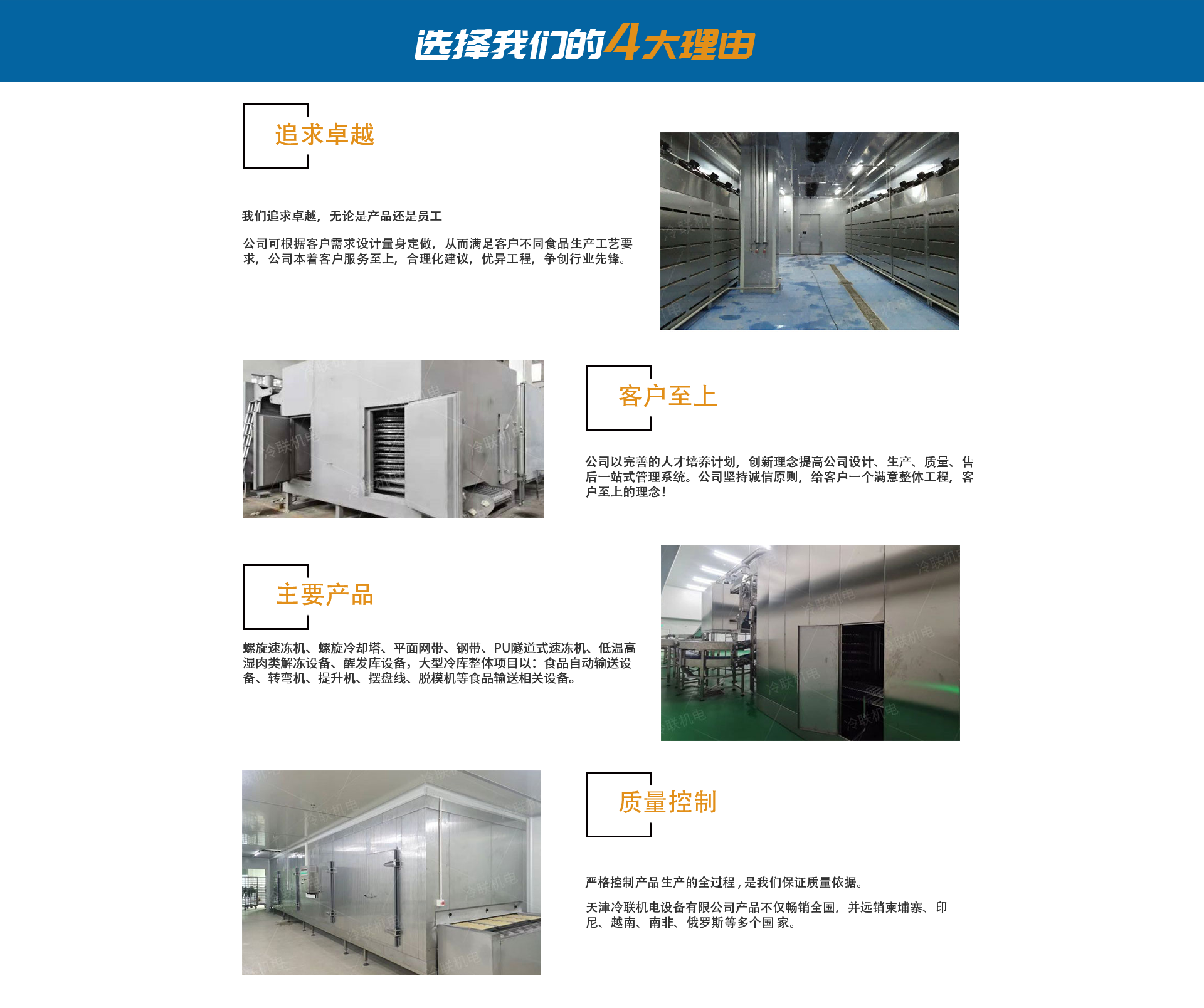 天津冷聯(lián)機(jī)電設(shè)備有限公司,是集科研、設(shè)計(jì)、制造、安裝、售后為一體的食品制冷機(jī)械公司。天津冷聯(lián)機(jī)電設(shè)備有限公司以生產(chǎn)制造速凍設(shè)備,冷卻設(shè)備。制冷工程,食品輸送線,肉類解凍設(shè)備為主的企業(yè)。公司坐落于天津市津南區(qū)咸水沽鎮(zhèn)海河工業(yè)園。公司可根據(jù)客戶需求設(shè)計(jì)量身定做,從而滿足客戶不同食品生產(chǎn)工藝要求,公司本著客戶服務(wù)至上,合理化建議,優(yōu)異工程,爭創(chuàng)行業(yè)先鋒。天津冷聯(lián)機(jī)電設(shè)備有限公司主要產(chǎn)品:螺旋速凍機(jī)、螺旋冷卻塔、平面網(wǎng)帶、鋼帶、PU隧道式速凍機(jī)、低溫高濕肉類解凍設(shè)備、醒發(fā)庫設(shè)備,大型冷庫整體項(xiàng)目以:食品自動(dòng)輸送設(shè)備、轉(zhuǎn)彎機(jī)、提升機(jī)、擺盤線、脫模機(jī)等食品輸送相關(guān)設(shè)備。天津冷聯(lián)機(jī)電設(shè)備有限公司產(chǎn)品銷往各地,遠(yuǎn)銷柬埔寨、印尼、越南、南非、俄羅斯等多個(gè)國家。公司以完善的人才培養(yǎng)計(jì)劃,創(chuàng)新理念提高公司設(shè)計(jì)、生產(chǎn)、質(zhì)量、售后管理系統(tǒng)。公司堅(jiān)持誠信原則,給客戶一個(gè)滿意整體工程,客戶至上的理念!